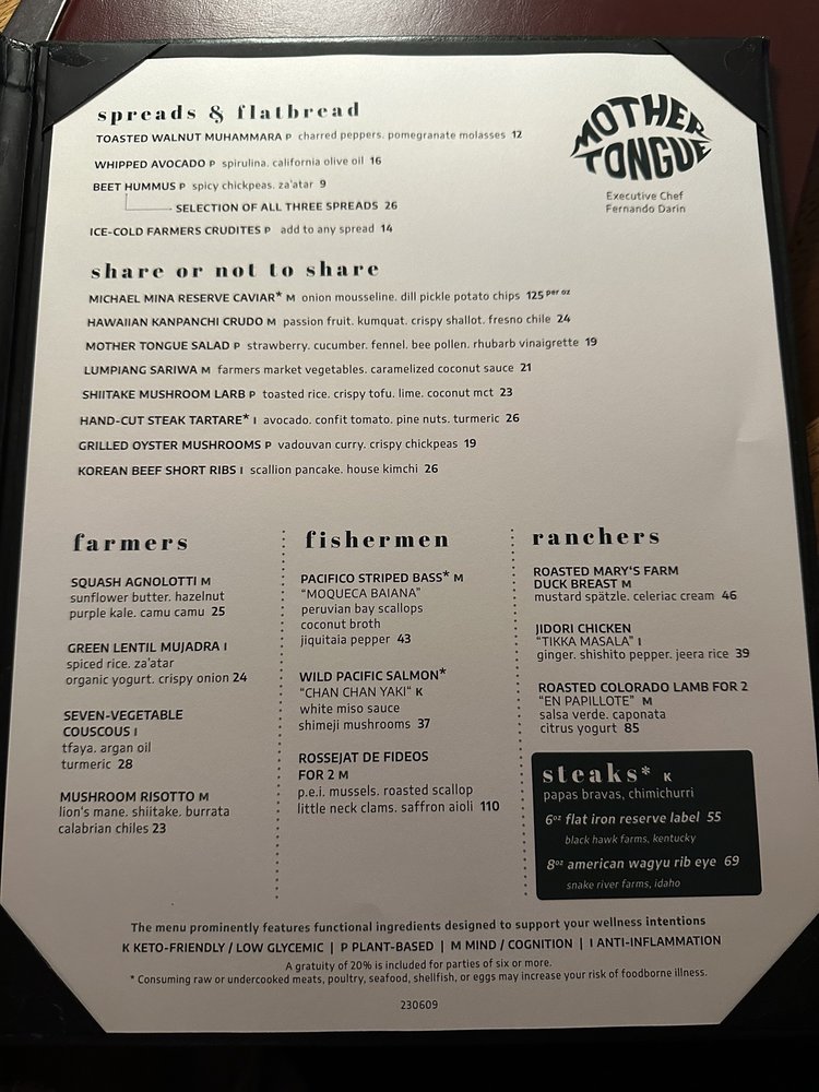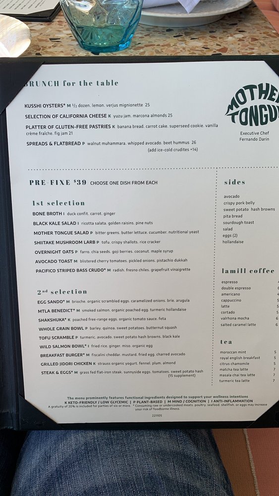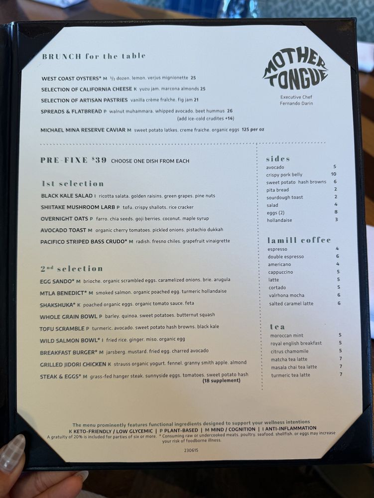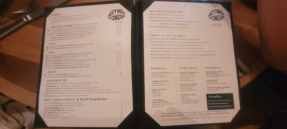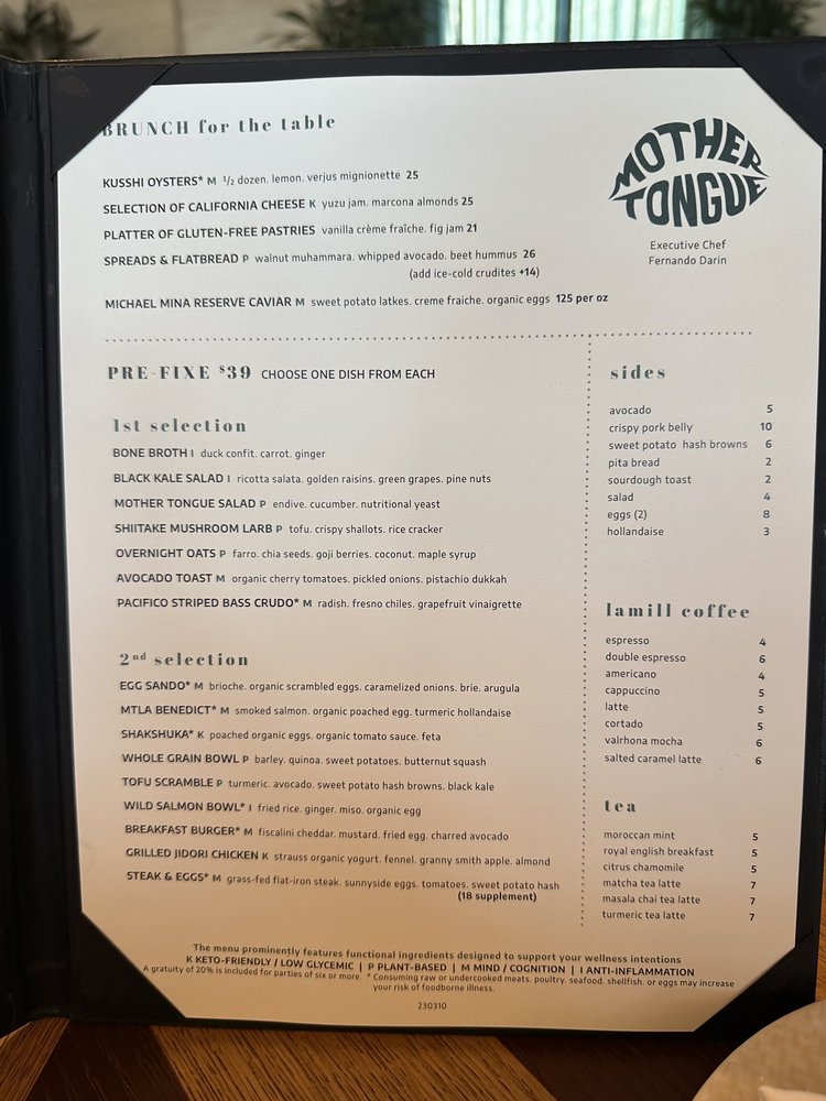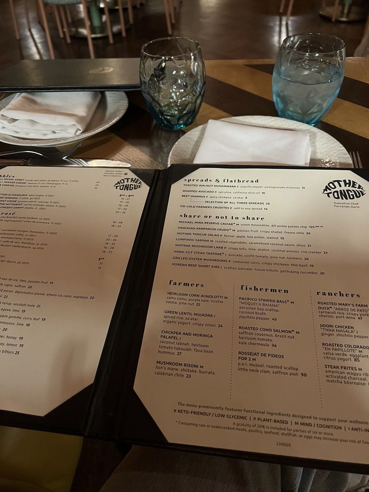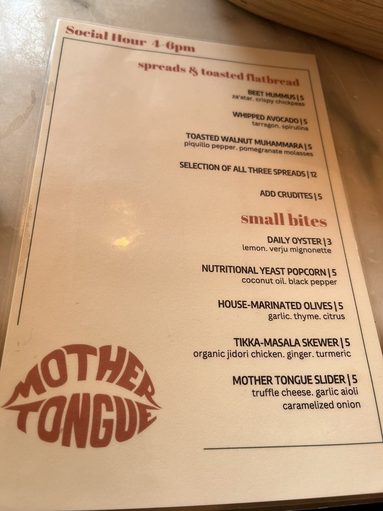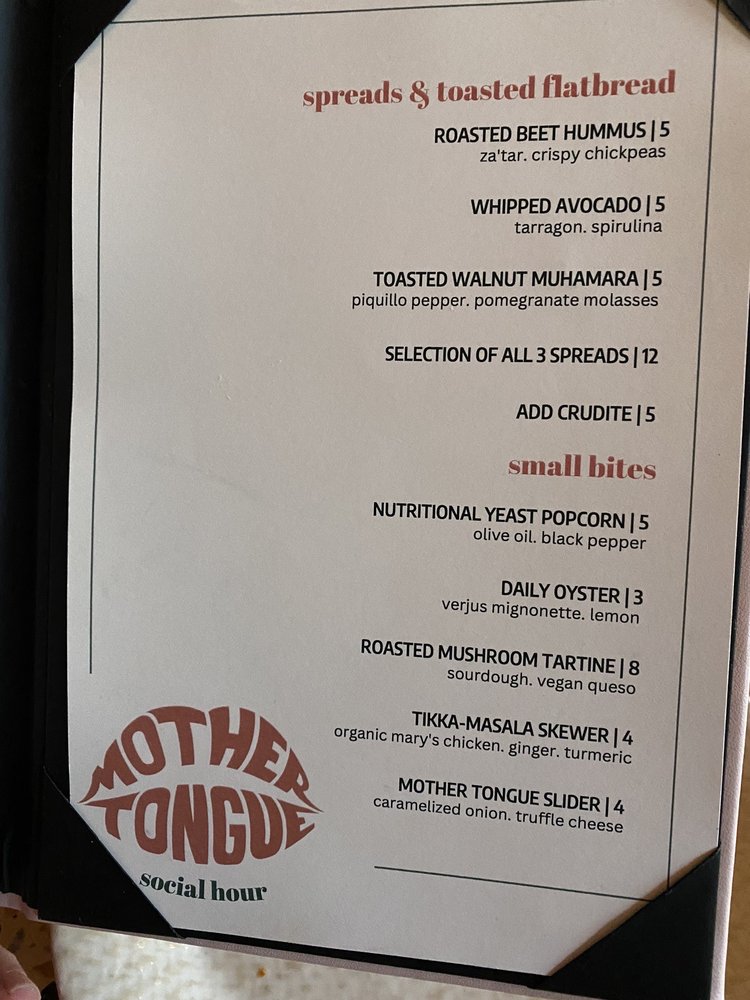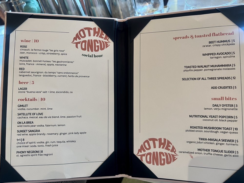 Introducing Mother Tongue, a trendy and upscale restaurant located in Los Angeles. Offering a variety of vegan and vegetarian options, Mother Tongue provides a unique dining experience with a diverse menu. Customers praise the ambience, attentive service, and creatively crafted dishes such as grilled oyster mushrooms, yellowtail crudo, corn agnolotti, and steak frites. With a beautiful rooftop terrace, Mother Tongue exceeds expectations with its flavorful and well-presented food. The restaurant also accommodates special dietary needs, serving gluten-free and vegan dishes. Mother Tongue is perfect for intimate gatherings or group outings, providing a memorable dining experience with exquisite flavors and exceptional service.
